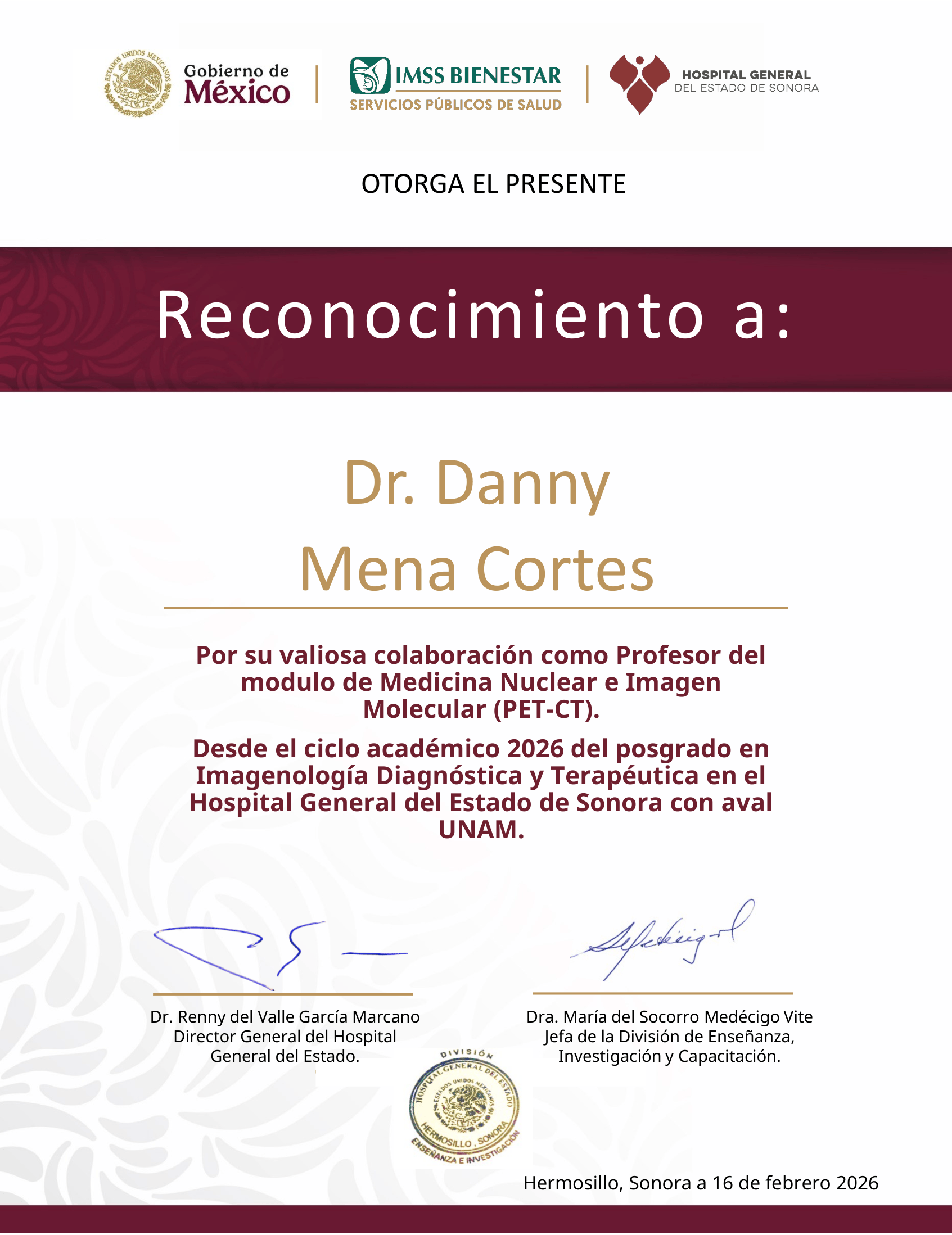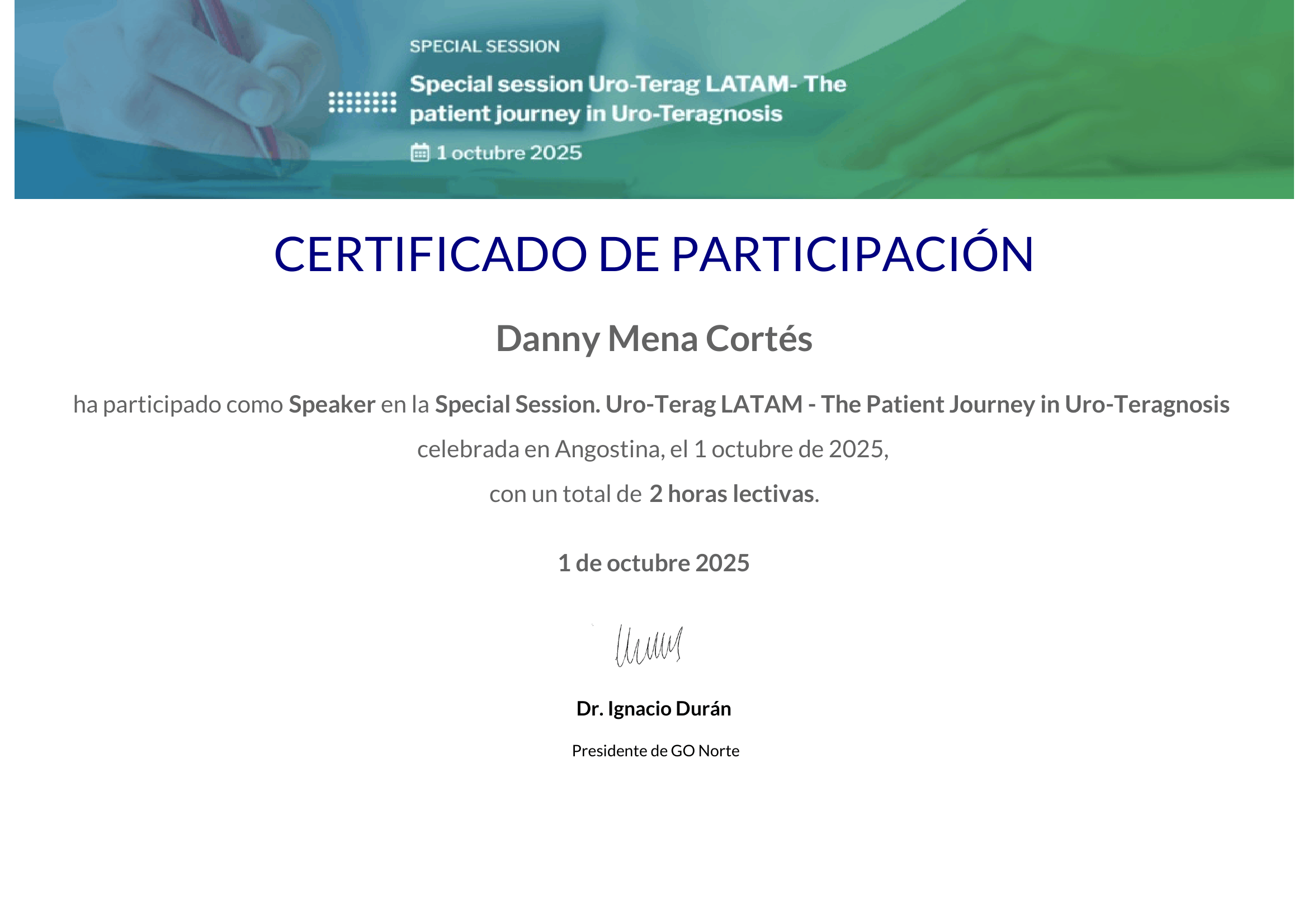 Hoy, el Dr. Mena Cortés es reconocido como líder de opinión en Latinoamérica, destacándose por su compromiso con la educación médica continua, la investigación clínica y el trabajo asistencial multidisciplinario, pilares que definen su práctica y su visión de la medicina nuclear moderna.